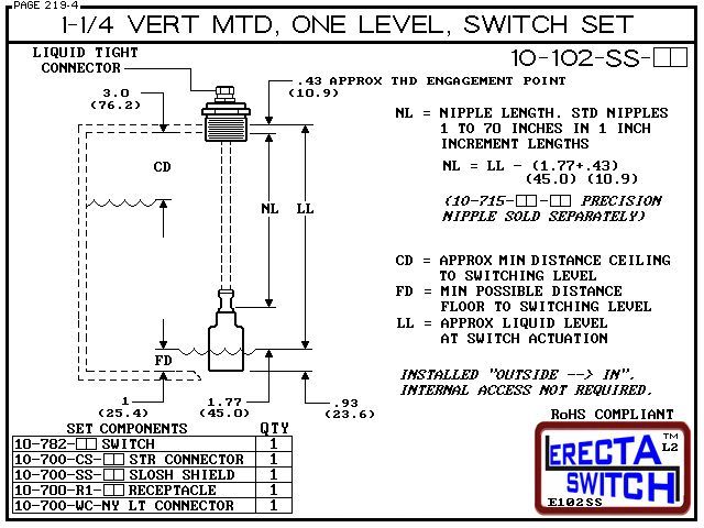 10-102-SS 1-1/4″ NPT Wiring Receptacle Vertical Mounted One Level Shielded Extended Stem Level Switch Set features a 1-1/4″ NPT wiring receptacle providing a weather tight chamber for wire splices. The liquid level switch set’s receptacle cap has a 1/2″ center knock out and set provides a liquid tight strain relief connector. The innovative snap on slosh shield dampens turbulence from agitation, proximity to tank filling etc… and protects the 10-782 level switch during installation and removal. Set includes everything except the 10-715-PP-XX precision nipple.10-715-PP-XX nipple is available in 1 inch increments from 1 – 70 inches. This item is sometimes referred to as a water level switch, float switch, or magnetic level switch.