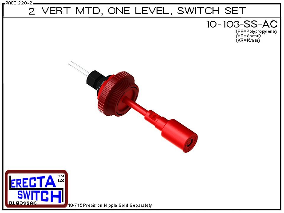 10-103-SS-AC 2″ NPT Vertical Mounted One Level Extended Stem Shielded Level Switch Set (Acetal) features a 1-1/4″ NPT wiring receptacle providing a weather tight chamber for wire splices, a 2″ NPT adapter, extended stem hardware and a slosh shield. The level switch set receptacle cap has a 1/2″ center knock out and set provides a liquid tight strain relief connector. The innovative snap on slosh shield dampens turbulence from agitation, proximity to tank filling etc… and protects the level switch during installation and removal. Liquid level switch Set includes everything except the 10-715-PP-XX precision nipple.10-715-PP-XX nipple is available in 1 inch increments from 1 – 70 inches. This level switch set is great for drum applications or any 2″ NPT female boss. This item is sometimes referred to as a water level switch, float switch, or magnetic level switch.