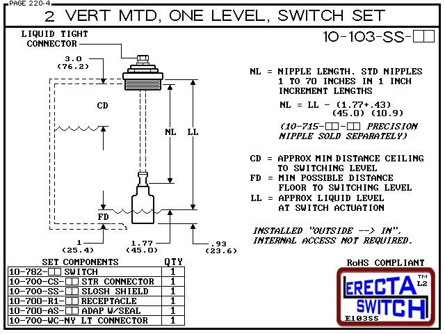 10-103-SS-PP 2″ NPT Vertical Mounted One Level Extended Stem Shielded Level Switch Set (Polypropylene) features a 1-1/4″ NPT wiring receptacle providing a weather tight chamber for wire splices, a 2″ NPT adapter, extended stem hardware and a slosh shield. The level switch set receptacle cap has a 1/2″ center knock out and set provides a liquid tight strain relief connector. The innovative snap on slosh shield dampens turbulence from agitation, proximity to tank filling etc… and protects the level switch during installation and removal. Liquid level switch Set includes everything except the 10-715-PP-XX precision nipple.10-715-PP-XX nipple is available in 1 inch increments from 1 – 70 inches. This level switch set is great for drum applications or any 2″ NPT female boss. This item is sometimes referred to as a water level switch, float switch, or magnetic level switch.