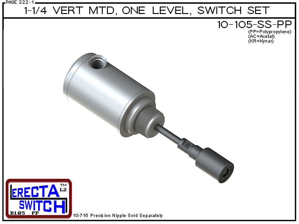 10-105-SS-PP 1-1/4″ NPT Relay Housing Vertical Mounted One Level extended Stem Shielded Level Switch Set (Polypropylene) features a 1-1/4″ NPT Relay Housing providing a liquid tight chamber for your control relay or wire splices. Housing includes an upper chamber with screw on lid to access external wiring and 1/2 NPT female boss for conduit connection. The innovative snap on slosh shield dampens turbulence from agitation, proximity to tank filling etc… and protects the level switch during installation and removal. liquid level switch set includes everything except the 10-715-PP-XX precision nipple.10-715-PP-XX nipple is available in 1 inch increments from 1 – 70 inches. This item is sometimes referred to as a water level switch, float switch, or magnetic level switch.