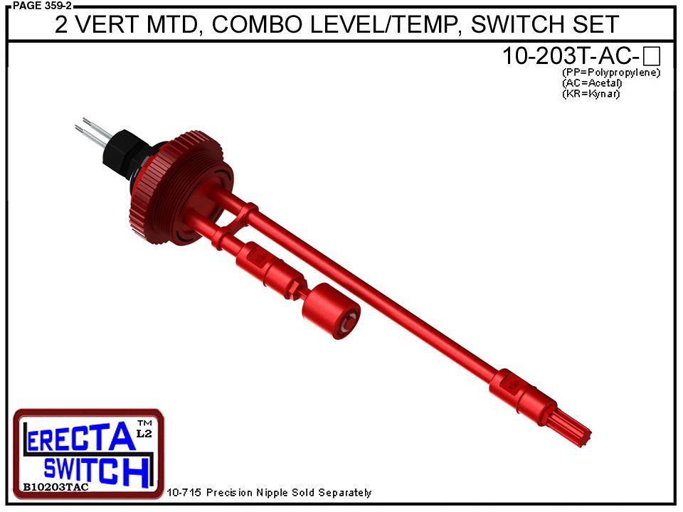 10-203T-AC 2” Vertical Mounted Combination Level Switch / Bi-Metallic Temperature Switch Set (Acetal) features a 1-1/4″ NPT receptacle providing a weather tight chamber for wire splices and a 2”NPT adapter. The Combination level switch and temperature switch set receptacle cap has a 1/2″ center knock out and set provides a liquid tight strain relief connector. Level Switch Temperature Switch Set includes everything except the 10-715-AC-XX precision nipples.10-715-AC-XX nipples are available in 1-inch increments from 1 – 70 inches. This Combination Level Switch / Temperature Switch Set is great for consolidating Level Sensing and temperature sensing in one stage for drum level/temperature sensing application and other applications with 2”NPT mounting requirements. This item is sometimes referred to as a water level switch, float switch, magnetic level switch, temperature switch or bi metallic temperature switch.