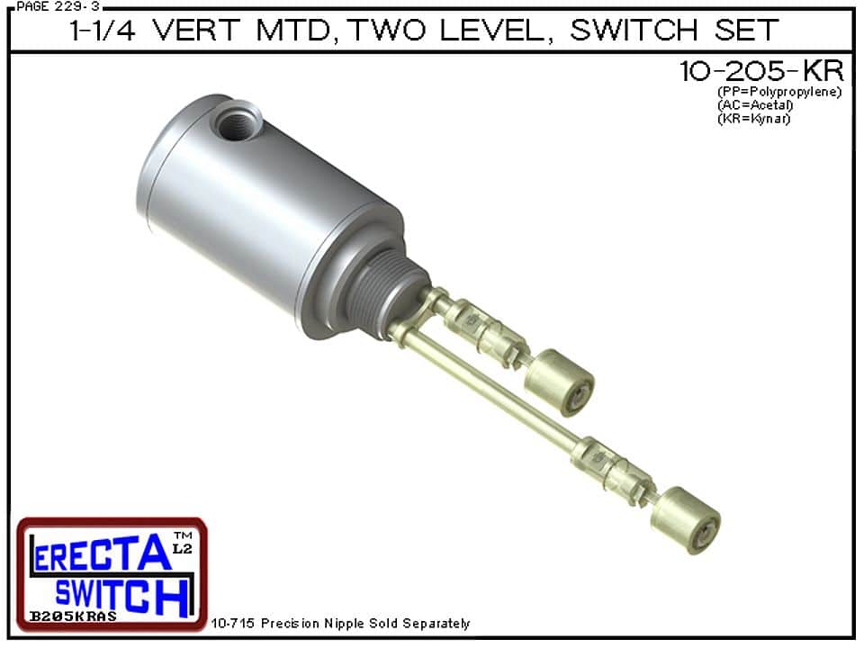 10-205-KR Multi Level Switch 1-1/4″ NPT Relay Housing Vertical Mounted Extended Two Level Switch Set (PVDF Kynar) features a 1-1/4″ NPT Relay Housing providing a liquid tight chamber for your control relay or wire splices. Multi Level Switch Set Housing includes an upper chamber with screw on lid to access external wiring and 1/2 NPT female boss for conduit connection. Everything is included in the multi level switch set except the 10-715-PP-XX precision nipples.10-715-PP-XX nipples are available in 1 inch increments from 1 – 70 inches. This multi level switch set is great for differential level sensing. This item is sometimes referred to as a water level switch, float switch, or magnetic level switch.
