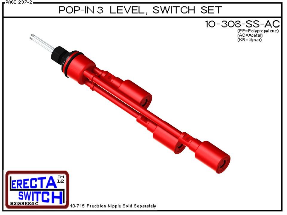 10-308-SS-AC Multi Level Switch Pop-In Extended Stem Shielded Three Level Switch Set (Acetal) features our unique Pop-in wiring receptacle providing a weather tight chamber for wire splices. The Pop-In receptacle cap has a 1/2″ center knock out and Multi Level Switch set provides a liquid tight strain relief connector. The innovative snap on slosh shields dampen turbulence from agitation, proximity to tank filling etc… and protect the liquid level switches during installation and removal. Multi Level Switch Set includes everything except the 10-715-PP-XX precision nipples.10-715-PP-XX nipples are available in 1 inch increments from 1 – 70 inches. If you need differential level sensing in a tank with a thin plastic bulkhead or tank lid (.062-.078), just punch a 1-9/16″ hole and this this multi level switch set just pops right in.This item is sometimes referred to as a water level switch, float switch, or magnetic level switch.