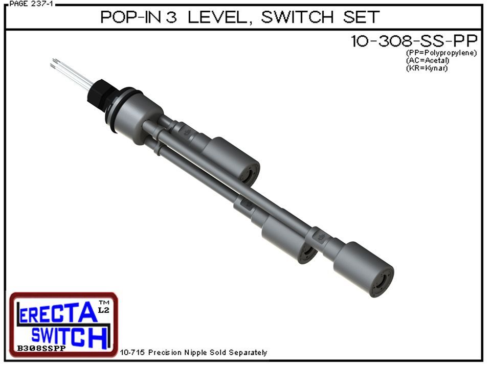10-308-SS-PP Multi Level Switch Pop-In Extended Stem Shielded Three Level Switch Set (Polypropylene) eatures our unique Pop-in wiring receptacle providing a weather tight chamber for wire splices. The Pop-In receptacle cap has a 1/2″ center knock out and Multi Level Switch set provides a liquid tight strain relief connector. The innovative snap on slosh shields dampen turbulence from agitation, proximity to tank filling etc… and protect the liquid level switches during installation and removal. Multi Level Switch Set includes everything except the 10-715-PP-XX precision nipples.10-715-PP-XX nipples are available in 1 inch increments from 1 – 70 inches. If you need differential level sensing in a tank with a thin plastic bulkhead or tank lid (.062-.078), just punch a 1-9/16″ hole and this this multi level switch set just pops right in.This item is sometimes referred to as a water level switch, float switch, or magnetic level switch.