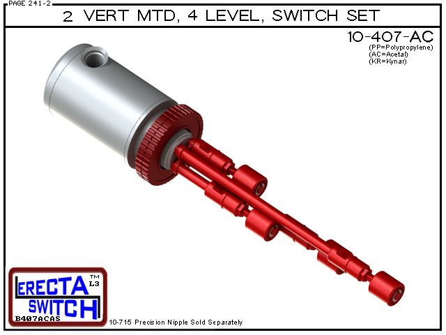 10-407 Flange Mounted Relay Housing Vertical Mounted Four Level Shielded Multi Level Switch Set features a 1-1/4″ NPT Relay Housing providing a liquid tight chamber for your control relay or wire splices and and our unique flange nuts. Flange nuts eliminate the need to install a threaded female boss in the top of your tank. The Housing in this multi level switch set includes an upper chamber with screw on lid to access external wiring and 1/2 NPT female boss for conduit connection. The innovative snap on slosh shields dampens turbulence from agitation, proximity to tank filling etc… and protect the liquid level switches during installation and removal. Everything except the 10-715-PP-XX precision nipples are included in this multi level switch set.10-715-PP-XX nipples are available in 1 inch increments from 1 – 70 inches. This multi level switch set is great for easy mounting on tanks with screw on tank lids or thin bulk heads.This item is sometimes referred to as a water level switch, float switch, or magnetic level switch.