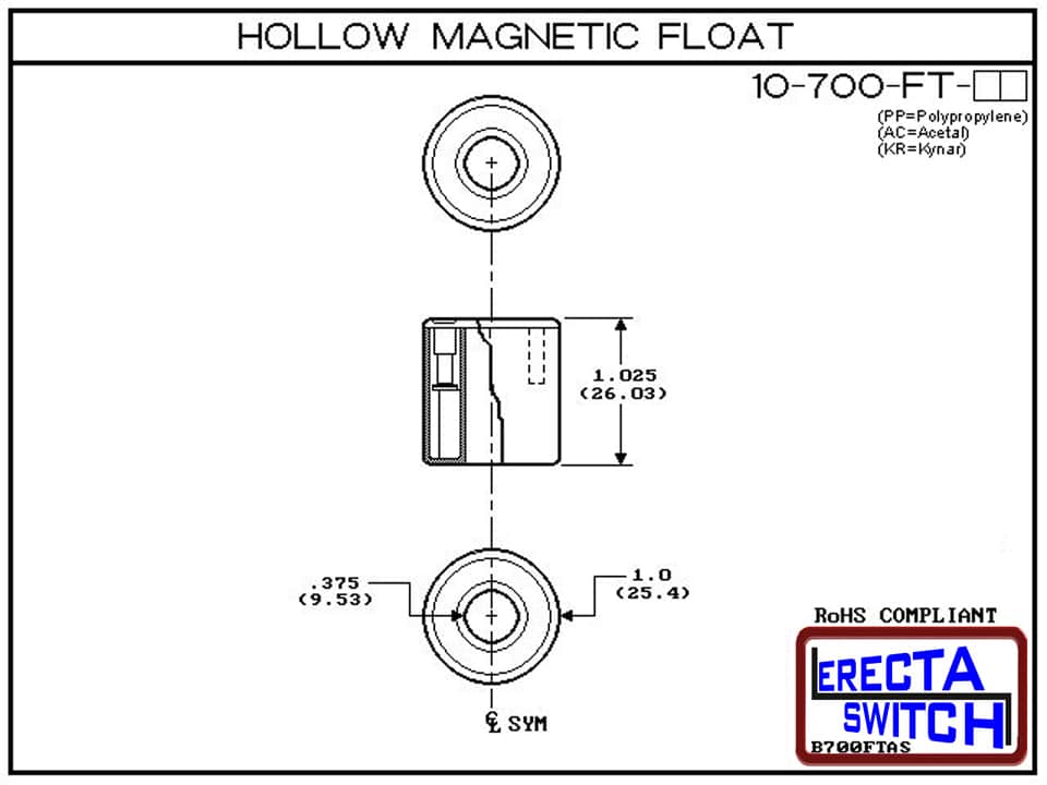 10-700-FT 1” Level Switch Float – The 10-700-FT 1” Level switch float is designed to be the principle float of our Series 10 level sensors but has found a base of customers/businesses fabricating their own custom level sensing solutions and need a generic 1 “float that they can buy as needed for their applications without the high tool cost to make them themselves. We see this as a perfect fit since we are not in the custom fabricating business and do not compete with our customers in those applications.