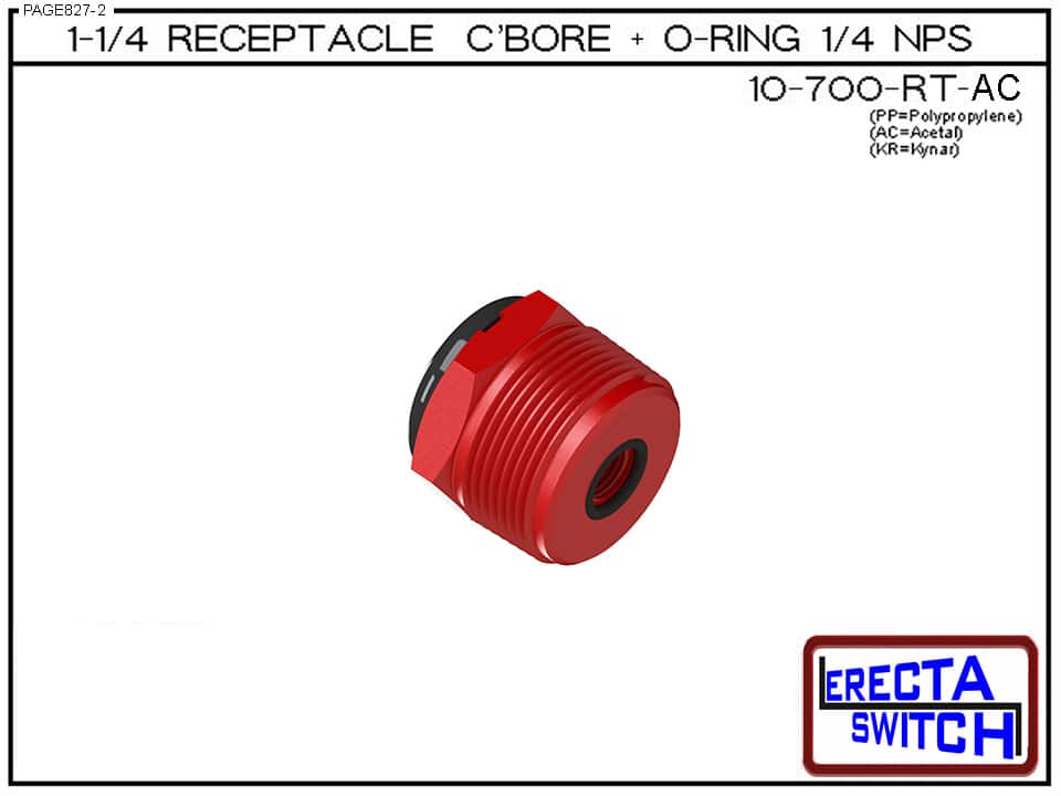 10-700-RT  1-1/4  NPT C’bore + O ring ¼ NPS Wiring Receptacle is designed to provide a 1-1/4 NPT mount and a weather tight enclosure for wiring connections. C’Bore and O ring ¼ NPS can be used with ERECTA SWITCH ¼ npt bulk head fittings to adapt to 1-1/4 NPT bulk head mount. Snap on cap features ½ inch center knock out to accommodate liquid tight strain relief connectors or other after market connectors.