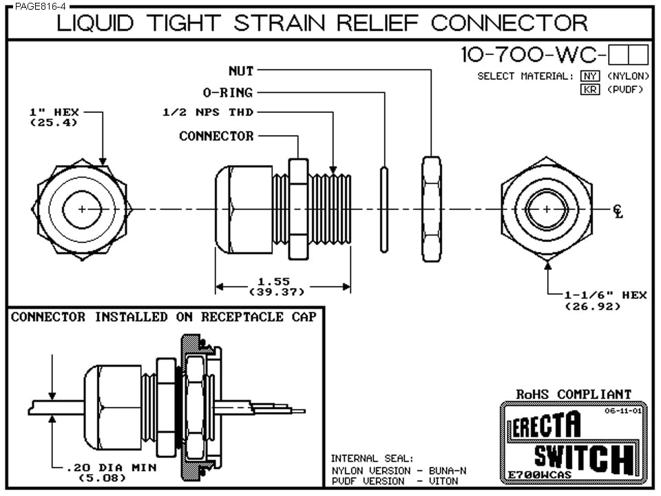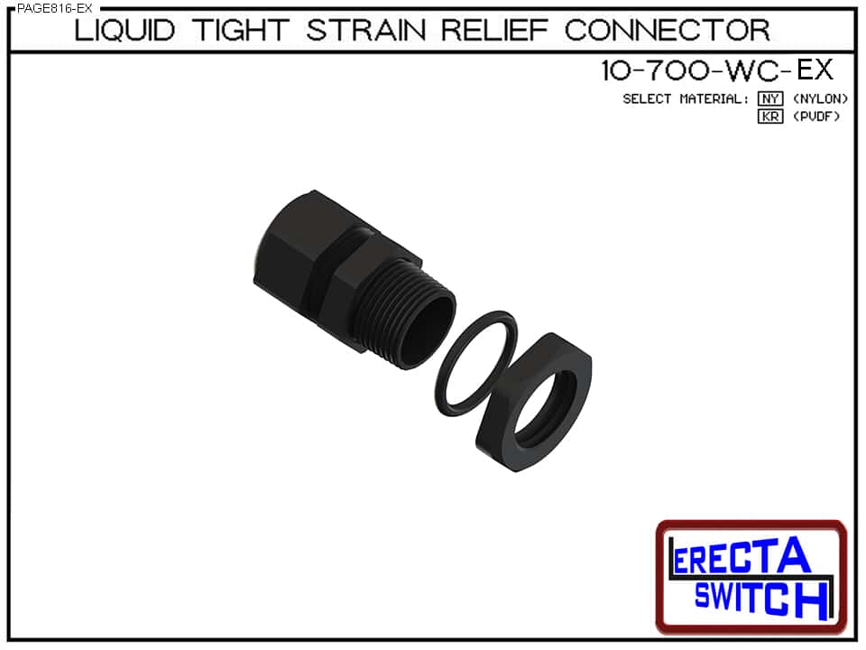 10-700-WC ½” Male Liquid Tight Strain Relief Connector features 1/2” NPT male threads with jam nut and o ring. This useful connector is often used with ERECTA SWITCH wiring enclosures to provide liquid tight relief from strain from vibration, pulling or tugging.