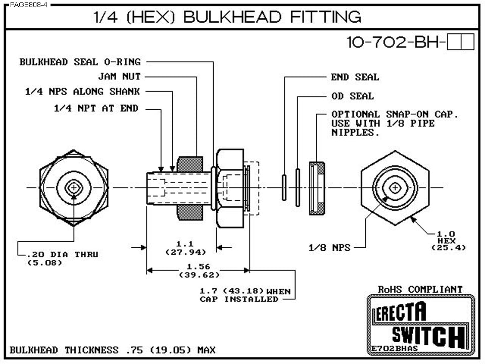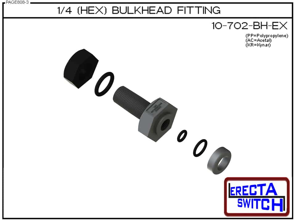 10-702-BH ΒΌ- 1/8 bulk head fitting is designed to convert our 10-782 small vertical level switch to a ¼” Mount with jam nut. The 10-702-BH can also be used with many of our competitor’s small vertical level switches as well. The 10-702-BH also connects to our 10-715 threaded 1/8 precision nipples enabling extended stem level switch configurations with 1/4 β€œbulkhead mount.