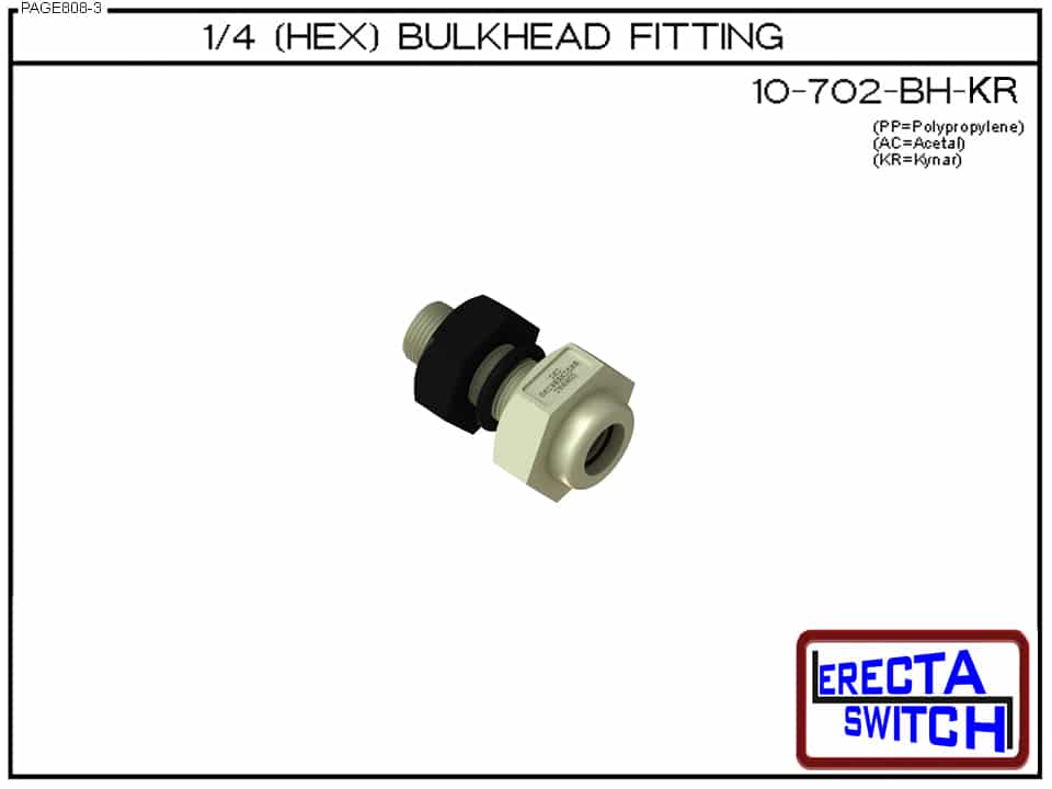 10-702-BH ΒΌ- 1/8 bulk head fitting is designed to convert our 10-782 small vertical level switch to a ¼” Mount with jam nut. The 10-702-BH can also be used with many of our competitor’s small vertical level switches as well. The 10-702-BH also connects to our 10-715 threaded 1/8 precision nipples enabling extended stem level switch configurations with 1/4 β€œbulkhead mount.