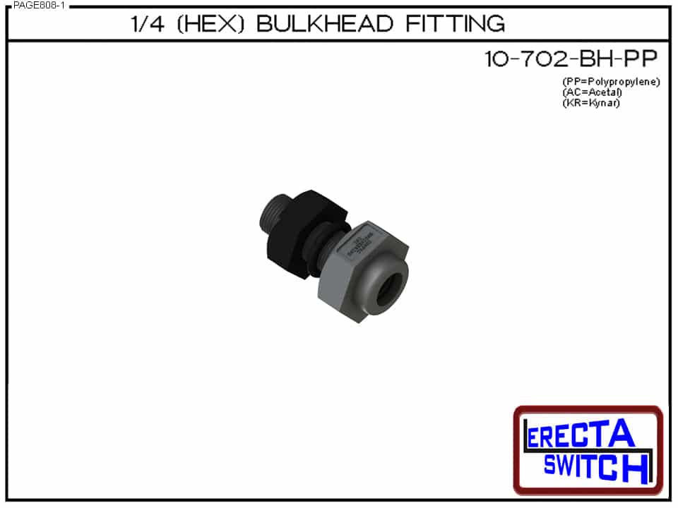 10-702-BH ΒΌ- 1/8 bulk head fitting is designed to convert our 10-782 small vertical level switch to a ¼” Mount with jam nut. The 10-702-BH can also be used with many of our competitor’s small vertical level switches as well. The 10-702-BH also connects to our 10-715 threaded 1/8 precision nipples enabling extended stem level switch configurations with 1/4 β€œbulkhead mount.