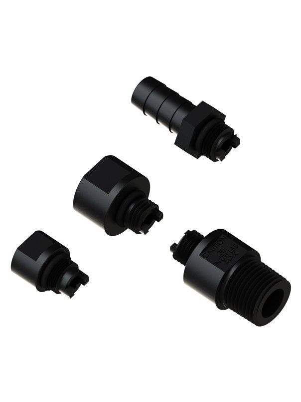 Each fitting seals securely on flow switches using a Viton O-ring, ensuring durability and leak-free performance.